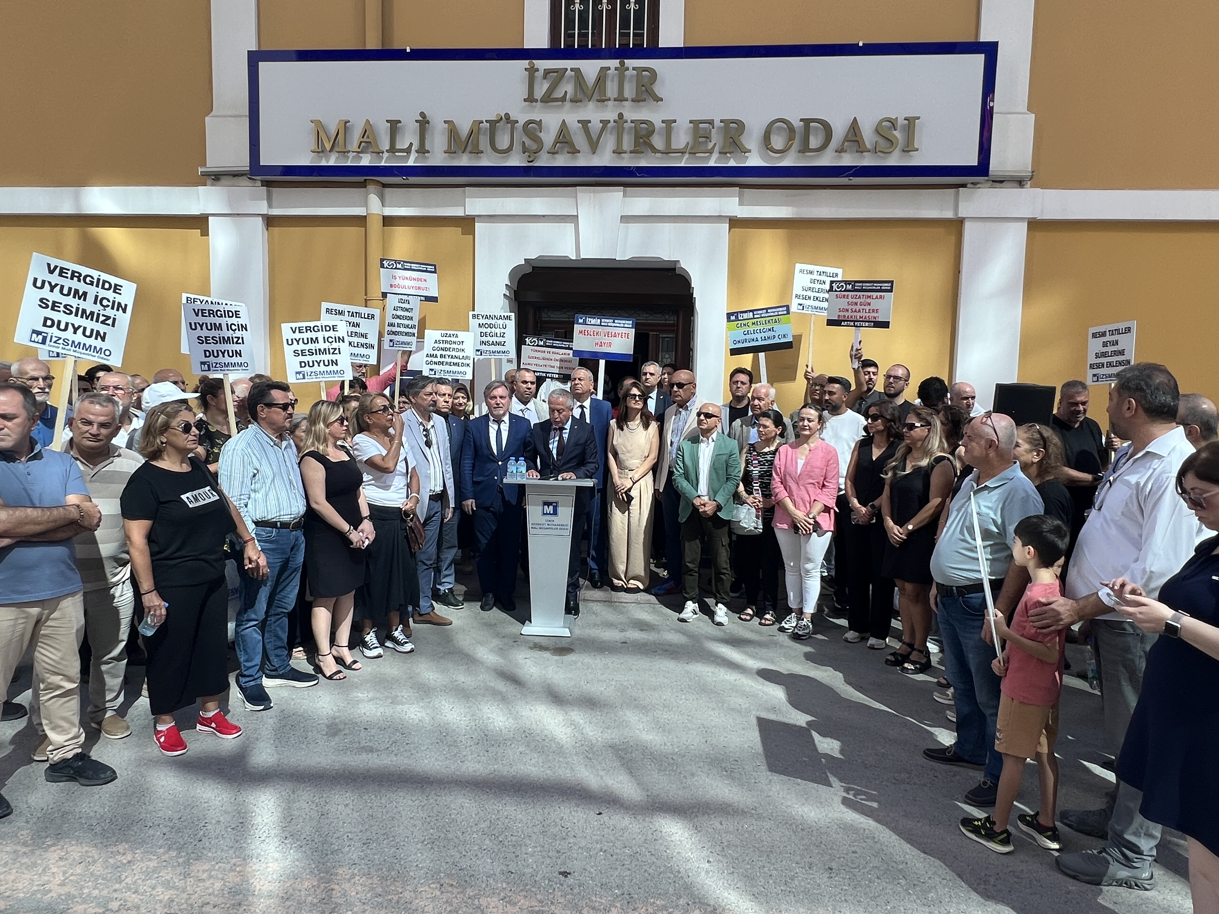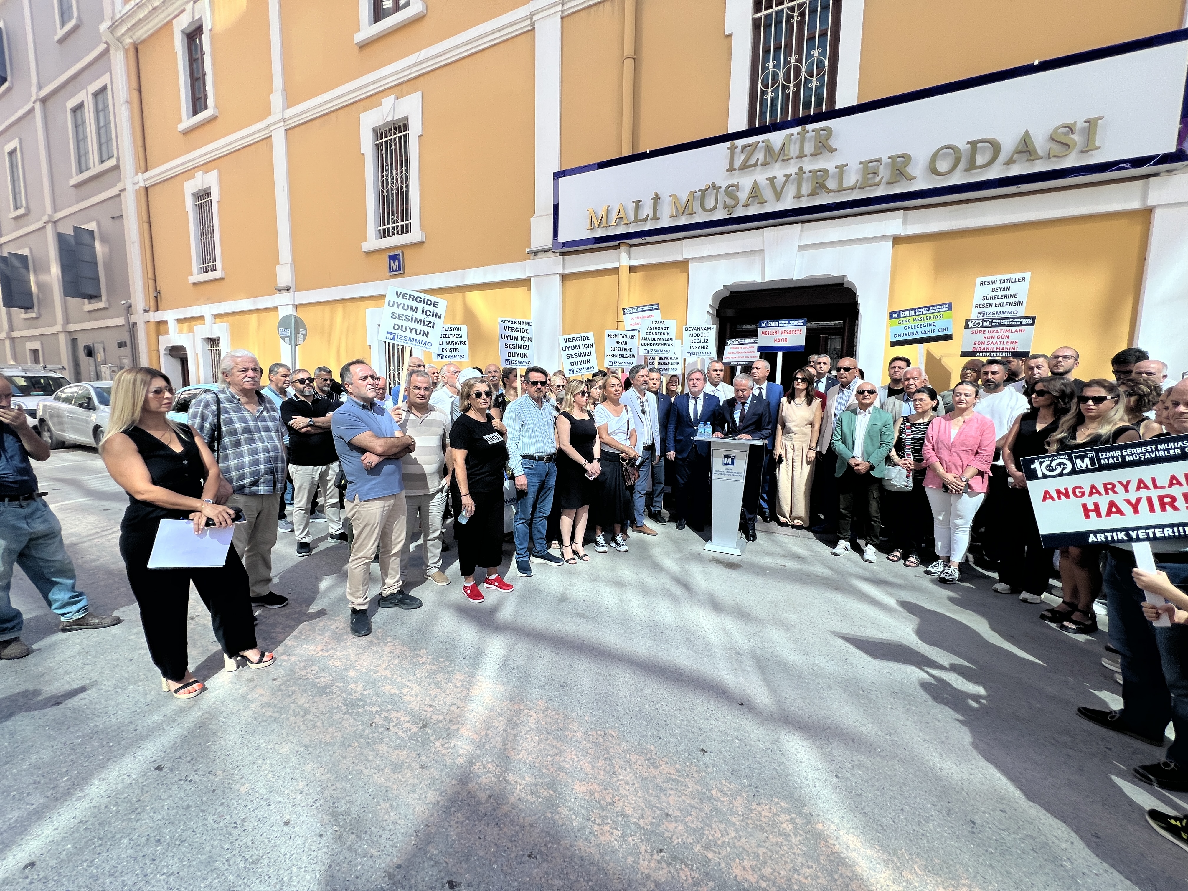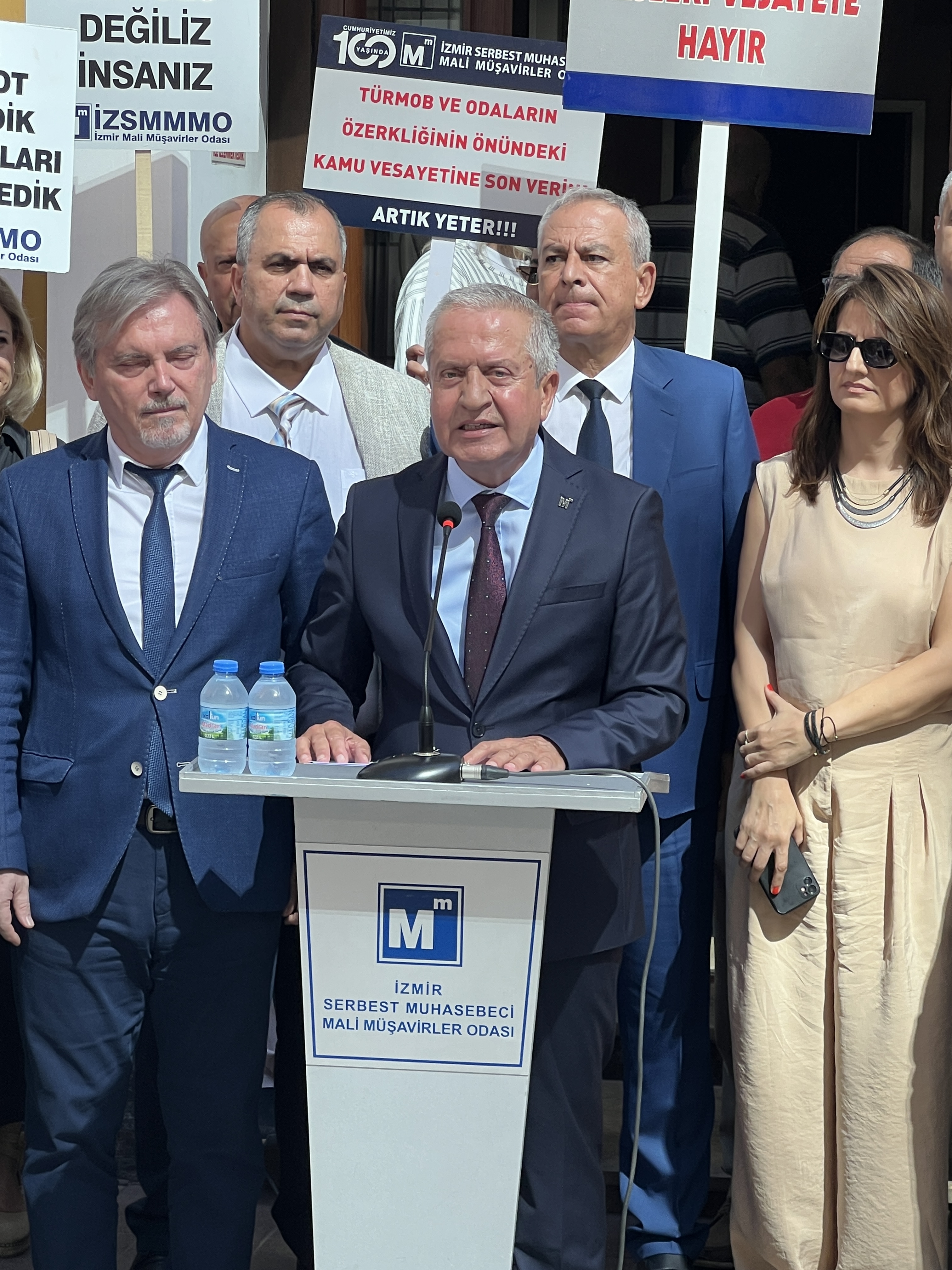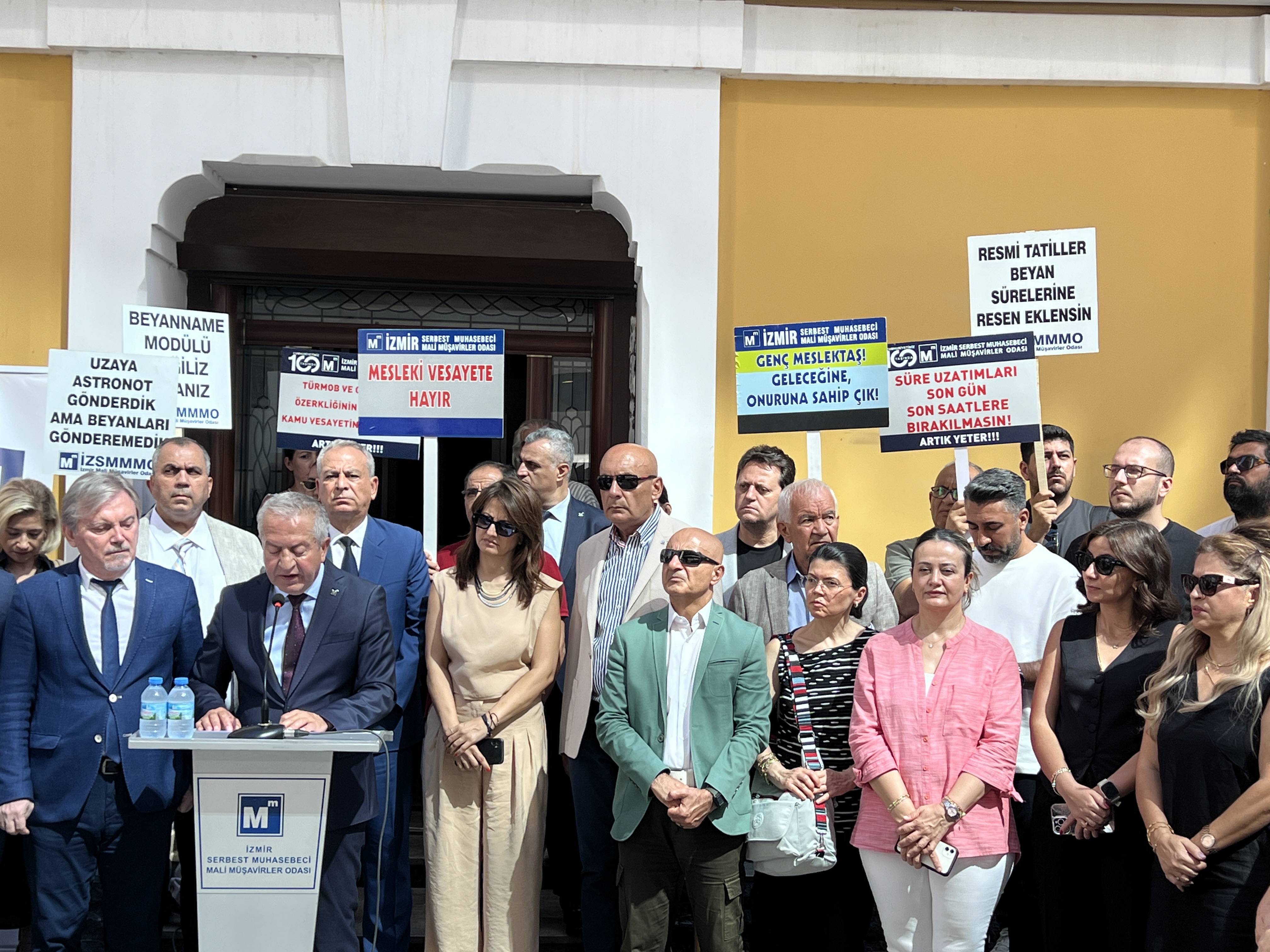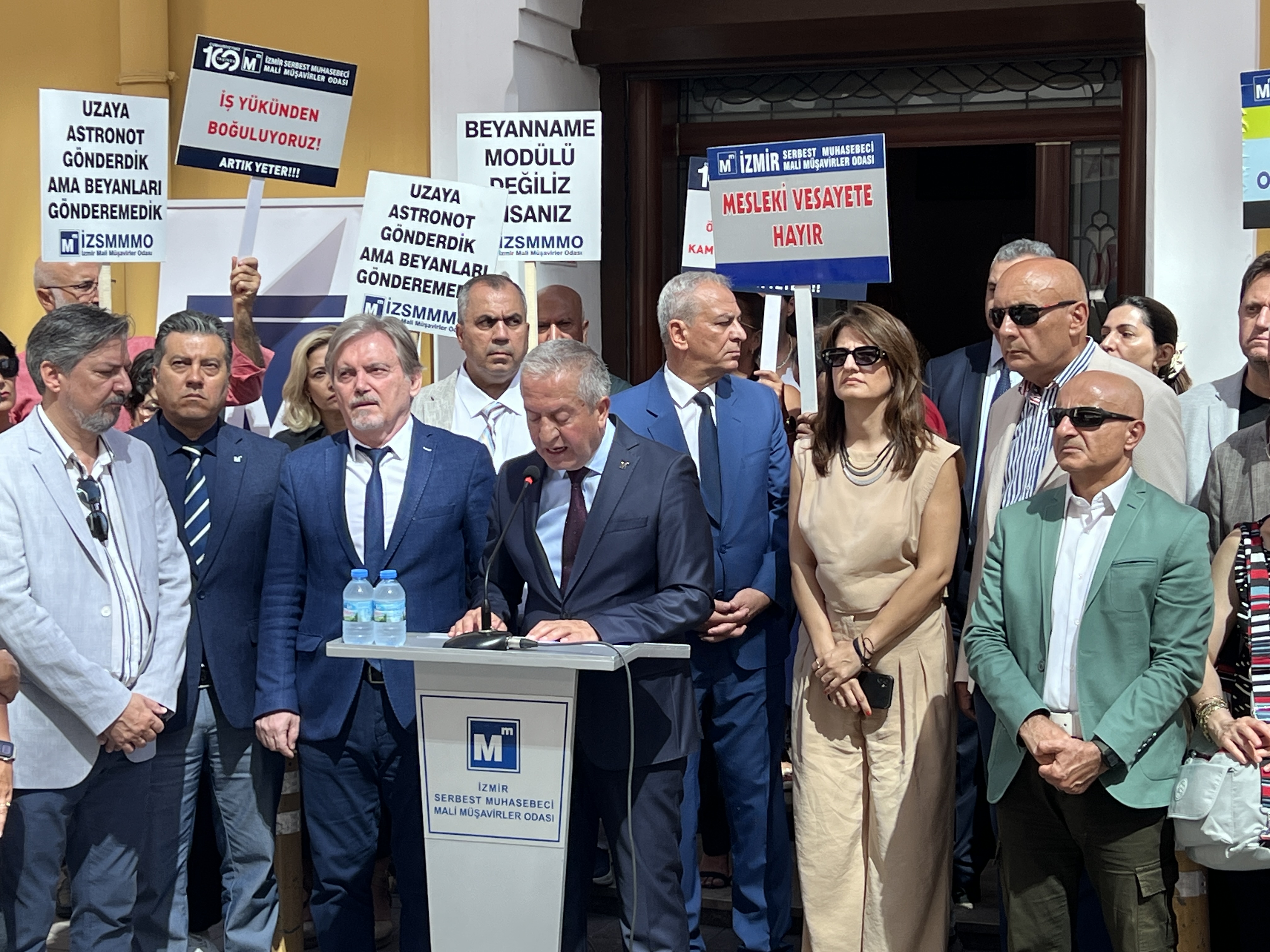 İzmir Serbest Muhasebeci Mali Müşavirler Odası (İZSMMMO) Yönetim Kurulu Başkanı Mehmet Kuzu, e-Defter uygulamasına ilişkin süreçlerdeki cezai yaptırımların ölçülü, adil ve hakkaniyetli şekilde düzenlenmesi yönündeki talepleri için basın açıklaması yaptı. İZSMMMO önünde yapılan basın açıklamasına çok sayıda mali müşavir katıldı. İZSMMMO Başkanı Kuzu, yaptığı basın açıklamasında şu görüşlere yer verdi:
