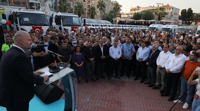 Peki bunlar Menemen için yeter mi? Yetmez dedik. Çünkü Menemenimizde her geçen gün artan nüfus ve beraberinde gelen ihtiyaçlar, belediyemizin hizmet alanını da genişletiyor. Bu bağlamda, temizlik, ulaşım, çevre düzenlemesi gibi birçok farklı alanda daha etkin ve verimli hizmet sunabilmek için araç parkımızı güncellemeye ihtiyaç duyduk. Cumhuriyetimizin 100. yılında bir ilke daha imza atarak, öz kaynaklarımızla aldığımız çöp kamyonlarından ekskavatörlere, minibüslerden panelvanlara, vinçlerden transit araçlara kadar toplam 100 yeni aracımızı daha envanterimize kazandırmış bulunuyoruz” dedi.