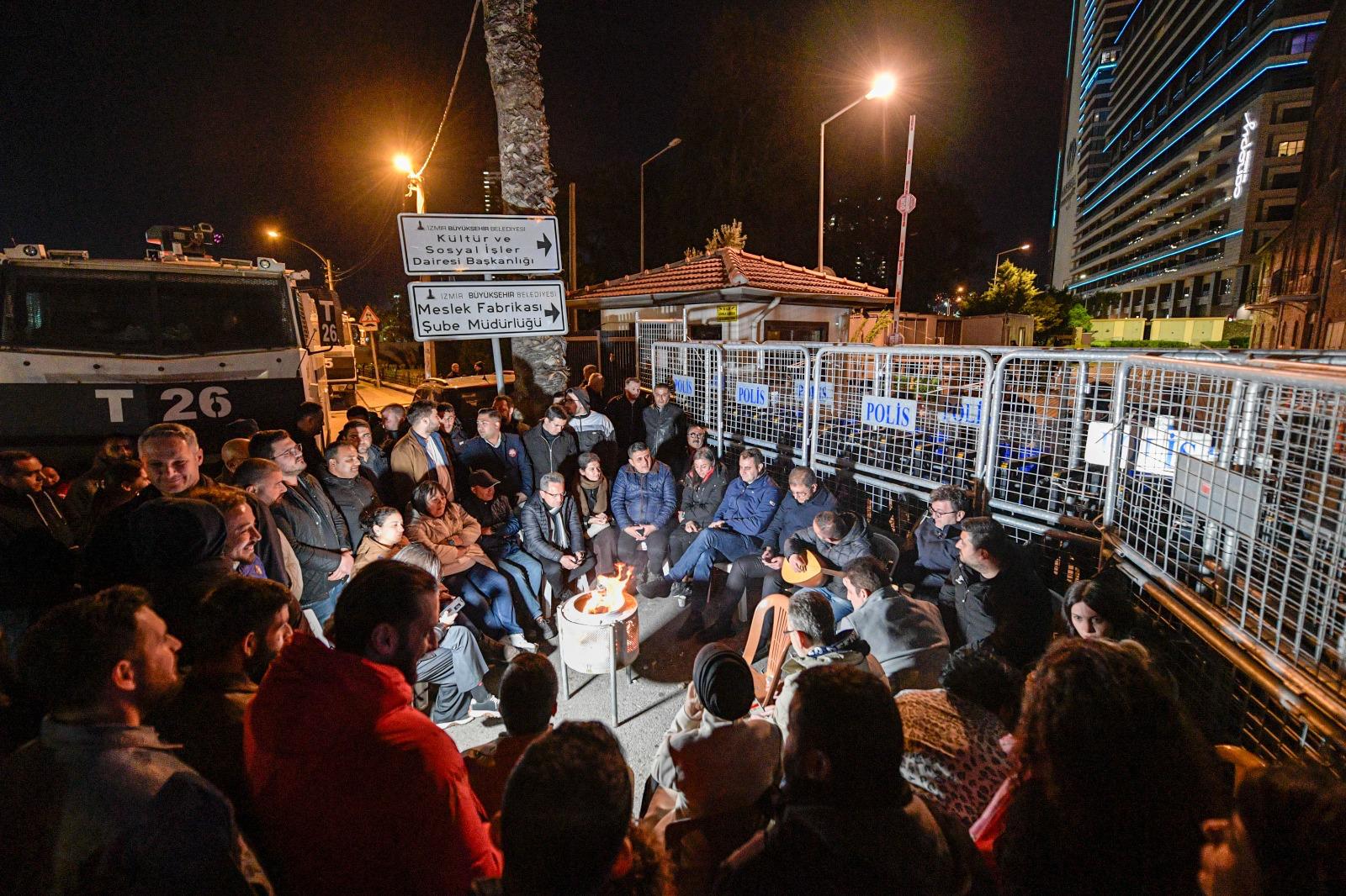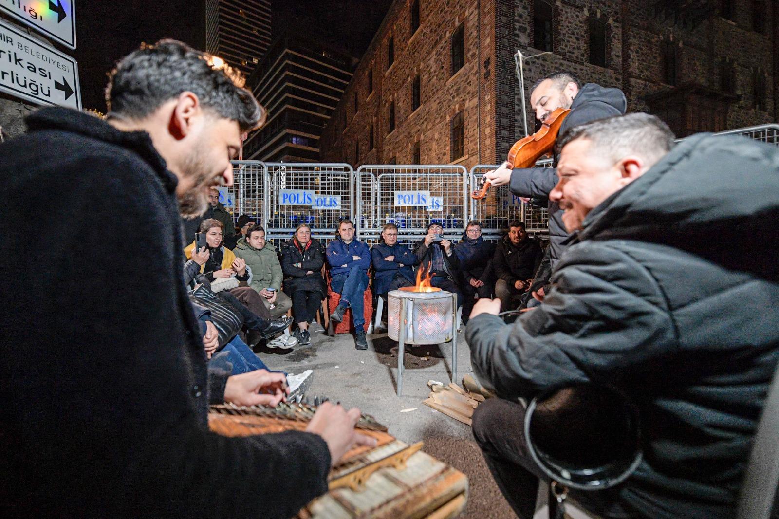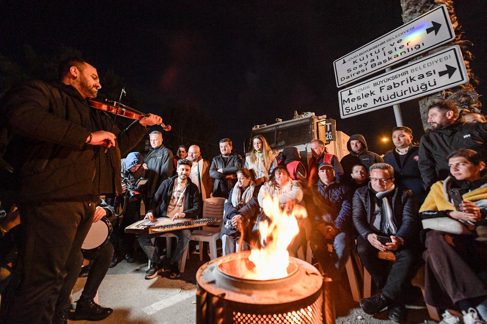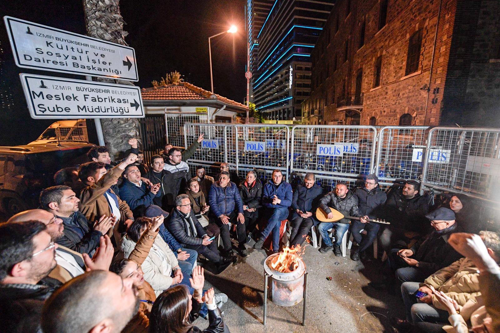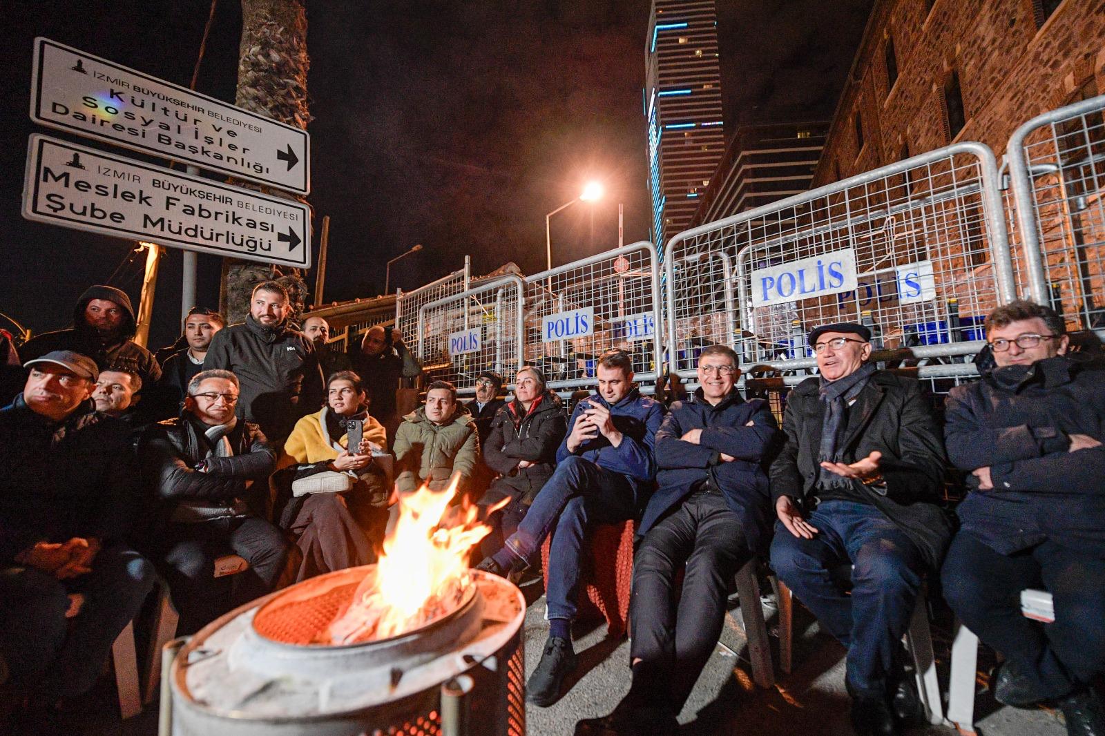 İzmir Büyükşehir Belediyesi’ne ait Meslek Fabrikası’na yönelik el koyma girişimine karşı başlatılan nöbet, perşembe gecesi de sürdü. Başkan Dr. Cemil Tugay öncülüğünde bir araya gelen yurttaşlar, türkülerle dayanışmayı büyüttü. CHP Şanlıurfa Milletvekili Mahmut Tanal da mücadeleye katıldı. Tanal, pense ile binayı çevreleyen polis barikatlarını birbirine bağlayan plastik kelepçeleri kesti.