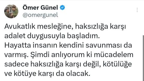EGEMENLİK - Kuşadası Belediye Başkanı Ömer Günel, İstanbul’da bu sabah gözaltına alınmasıyla ilgili sosyal medya hesapları üzerinden bir paylaşım yaptı. Başkan Ömer Günel paylaşımında, “Avukatlık mesleğine, haksızlığa karşı adalet duygusuyla başladım. Hayatta insanın kendini savunması da varmış. Şimdi anlıyorum ki mücadelem sadece haksızlığa karşı değil, kötülüğe ve kötüye karşı da olacak” ifadelerine yer verdi.