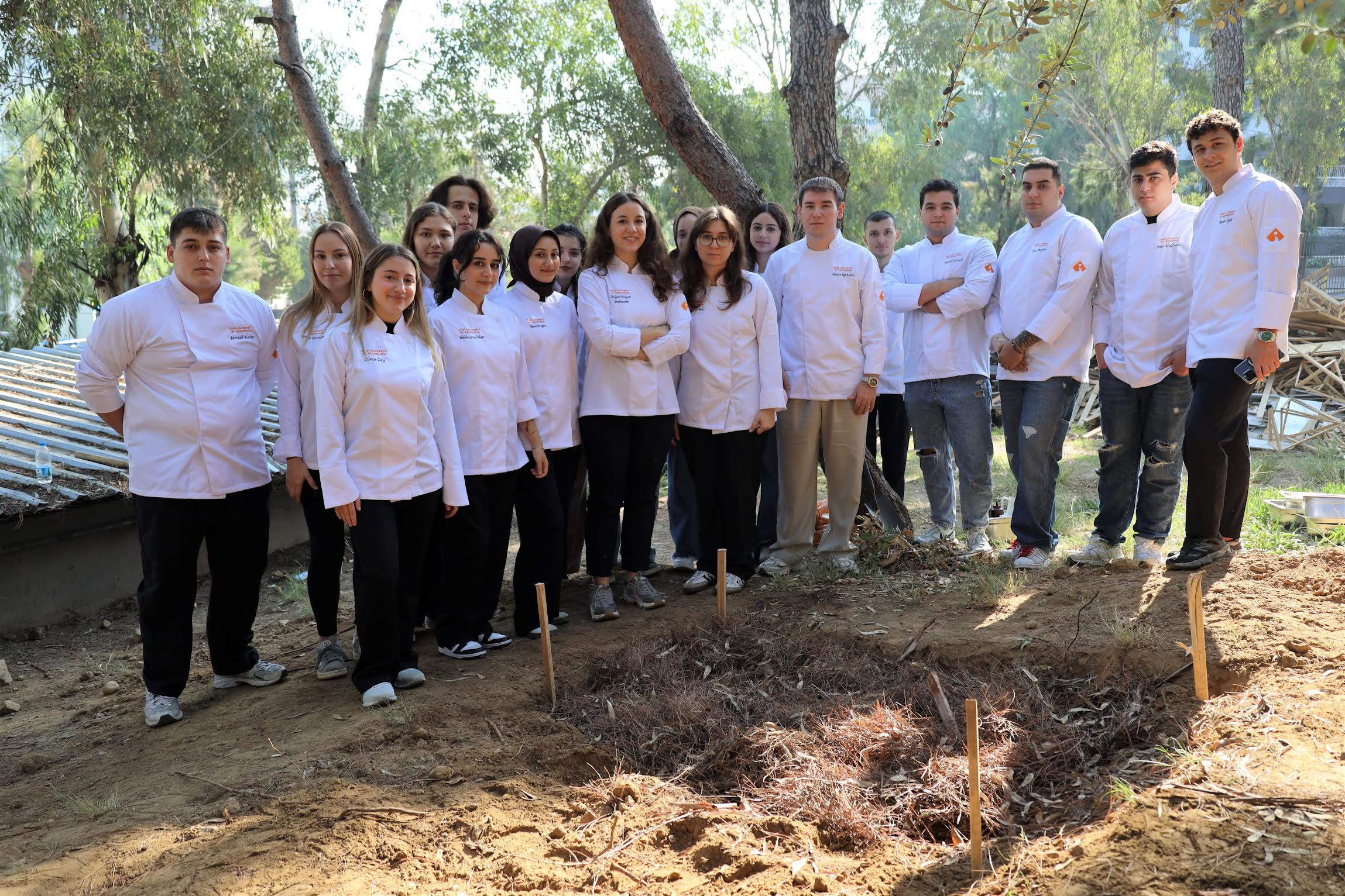 Birinci sınıfta eğitim gören 35 öğrenci, ‘sıfır atık’ için el ele vererek ‘Mutfakla İlgili Kavram ve Beceriler’ dersi kapsamında oluşan sebze atıklarını bir hafta boyunca biriktirdi. Öğrenciler, bu atıkları da ağartılmamış kâğıt, yumurta kabukları ve kuru yaprak gibi organik malzemelerle zenginleştirerek kampüste kompost alanı olarak belirlenen toprağa gömdü.