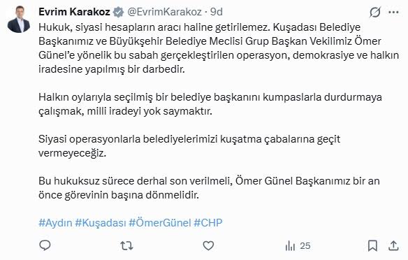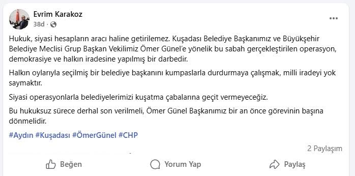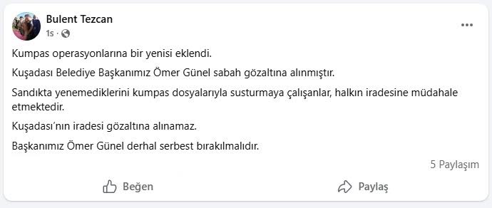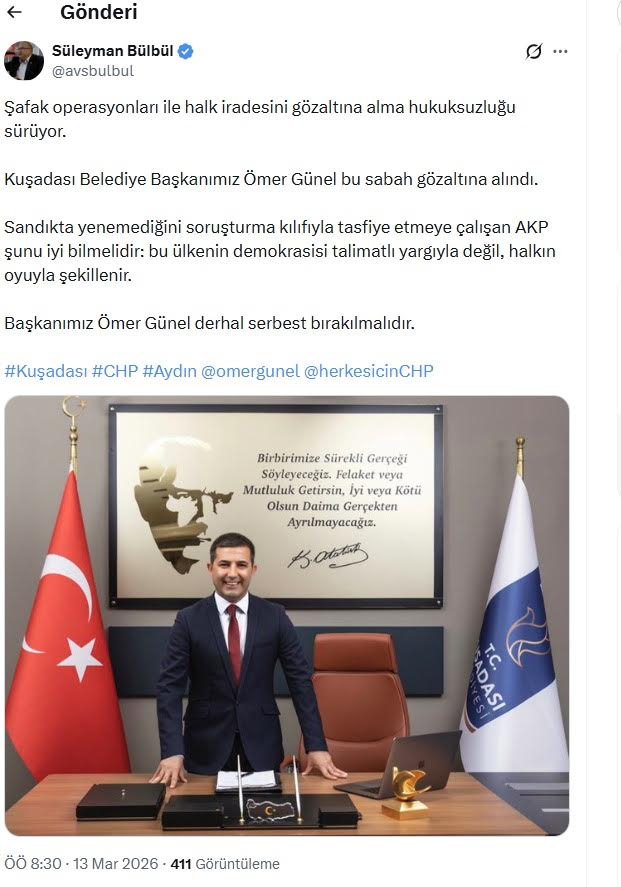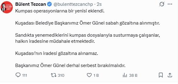 EGEMENLİK - Kuşadası Belediye Başkanı Ömer Günel, bugün sabah saatlerinde henüz bilinmeyen bir nedenle gözaltına alındı. Başkan Ömer Günel’in gözaltına alınmasına CHP Aydın Milletvekili Bülent Tezcan, Süleyman Bülbül ve Evrim Karakoz sosyal medya hesaplarından yaptıkları açıklamayla sert tepki gösterdi. Olayı ‘kumpas’ operasyonu olarak nitelendiren CHP Aydın Milletvekili Bülent Tezcan, sosyal medya hesabından yaptığı açıklamada, “Kuşadası Belediye Başkanımız Ömer Günel, sabah gözaltına alınmıştır. Sandıkta yenemediklerini, kumpas dosyalarıyla susturmaya çalışanlar, halkın iradesine müdahale etmektedir. Kuşadası’nın iradesi gözaltına alınamaz. Başkanımız Ömer Günel derhal serbest bırakılmalıdır” ifadelerini kullandı. “ŞAFAK OPERASYONLARI İLE HALK İRADESİ GÖZALTINA ALINIYOR”CHP Aydın Milletvekili Süleyman Bülbül ise, “Şafak operasyonları ile halk iradesini gözaltına alma operasyonu sürüyor. Kuşadası Belediye Başkanımız bu sabah gözaltına alındı. Sandıkta yenemediğini, soruşturma kılıfıyla tasfiye etmeye çalışan AKP şunu iyi bilmelidir; bu ülkenin demokrasisi talimatlı yargıyla değil, halkın oyuyla şekillenir. Başkanımız Ömer Günel derhal serbest bırakılmalıdır” dedi. “DEMOKRASİYE VE HALK İRADESİNE YAPILMIŞ BİR DARBEDİR”CHP Aydın Milletvekili Evrim Karakoz da, “Hukuk, siyasi hesapların aracı haline getirilemez. Kuşadası Belediye Başkanımız ve Büyükşehir Belediye Meclisi Grup Başkan Vekilimiz Ömer Günel’e yönelik bu sabah gerçekleştirilen operasyon, demokrasiye ve halkın iradesine yapılmış bir darbedir. Halkın oylarıyla seçilmiş bir belediye başkanını kumpaslarla durdurmaya çalışmak, milli iradeyi yok saymaktır. Siyasi operasyonlarla belediyelerimizi kuşatma çabalarına geçit vermeyeceğiz. Bu hukuksuz sürece derhal son verilmeli, Ömer Günel Başkanımız bir an önce görevinin başına dönmelidir” ifadelerine yer verdi.