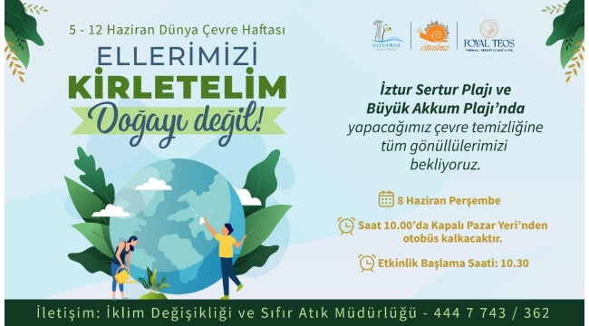 Seferihisar Belediyesi, Dünya Çevre Haftası’nda ilçedeki vatandaşları plajlarda çevre temizliğine davet etti. Temizlik seferberliği, 8 Haziran Perşembe günü İztur Sertur Plajı ve Büyük Akkum Plajı’nda gerçekleştirilecek.