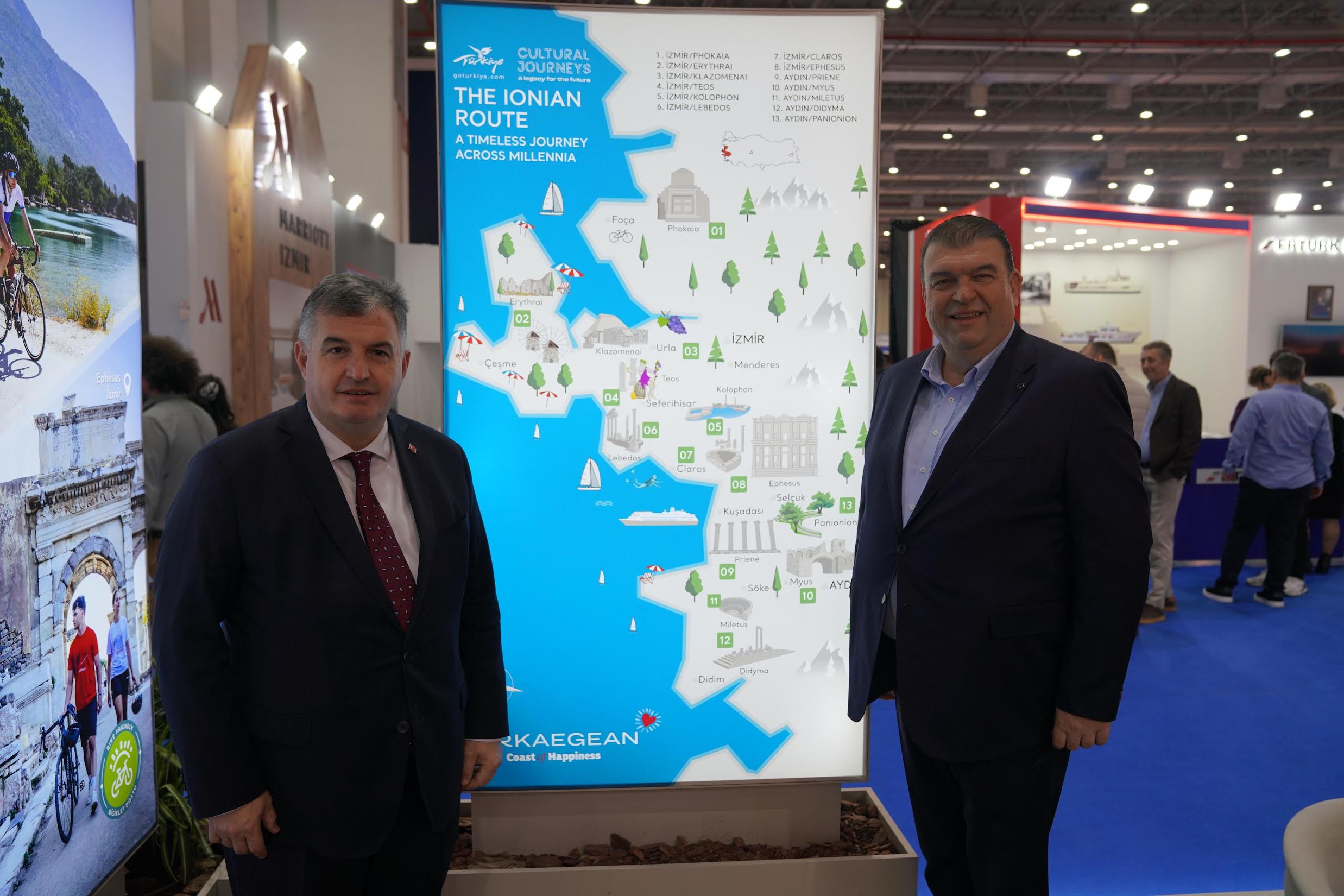 Kazakistan Başkonsolosu Bauyrzhan Akatov ve beraberindeki heyet, Seferihisar standını ziyaret ederek ilçenin turizm vizyonu, kültürel projeleri ve yeni dönem hedefleri hakkında Başkan Yetişkin’den bilgi aldı.Başkan Yetişkin ayrıca fuar kapsamında; İl Kültür ve Turizm Müdürü Sadık Doğruer, İzmir Ticaret Odası Turizm Komite Başkanı Ahmet Kilimci, Manisa Büyükşehir Belediye Başkanı Besim Dutlulu, Katip Çelebi Üniversitesi Turizm Fakültesi Dekanı Prof. Dr. Emre Güler ile bir araya gelerek bölgesel turizm iş birliklerini, yeni proje ortaklıklarını ve sektörün geleceğine dair değerlendirmelerde bulundu.Bu görüşmelerin, Seferihisar’ın turizmdeki ivmesini güçlendirmesi ve uluslararası görünürlüğünü artırması açısından önemli bir adım olduğu vurgulandı.İON Rotası ulusal proje olarak tanıtıldıKültür ve Turizm Bakanlığı / TGA tarafından İON Rotası’nın ilk kez ulusal bir proje olarak bu fuarda tanıtılması, Seferihisar adına önemli bir gelişme olarak öne çıktı. Seferihisar Belediyesi öncülüğünde hayata geçirilen rota; akademik çevreler, turizm profesyonelleri ve yabancı ziyaretçilerden yoğun ilgi gördü. Projenin, bölgenin kültürel miras turizmine yeni bir dinamizm kazandırması bekleniyor.Ürkmez Kadın Tiyatrosu fuarın renkli yüzü olduSeferihisar’ın yerel kültürel üretimini temsil eden Ürkmez Kadın Tiyatrosu, fuar süresince gerçekleştirdiği performanslarla ziyaretçilerin dikkatini çekti. Kadınların kültürel ve sanatsal üretimdeki gücünü sahneye taşıyan ekip, fuarın en renkli ve ilgi çeken gruplarından biri oldu.TTI İzmir Turizm Fuarı, Seferihisar’ın turizm potansiyelini uluslararası arenada tanıtması, yeni iş birlikleri kurması ve bölgesel kalkınmaya katkı sağlayacak projelerin temellerini atması açısından önemli bir platform olmayı sürdürüyor.