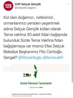 48 saatte 21 ilde 44 ayrı noktada meydana gelen yangınlar Türkiye’yi yakıp kavururken, CHP Selçuk Gençlik kollarının Tema Vakfına 30 adet fidan bağışı yaparak başlattığı zincir kampanyasına destek yağdı. CHP'li Gençler, yaptıkları bağışla Efes Selçuk Belediye Başkanı Filiz Ceritoğlu Sengel'e kampanyaya destek çağrısında bulunarak zinciri başlattılar.