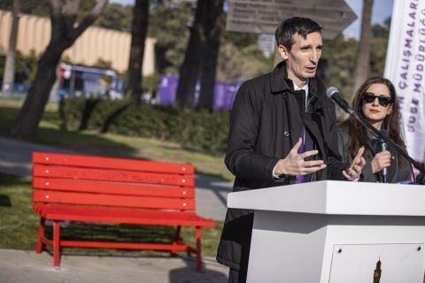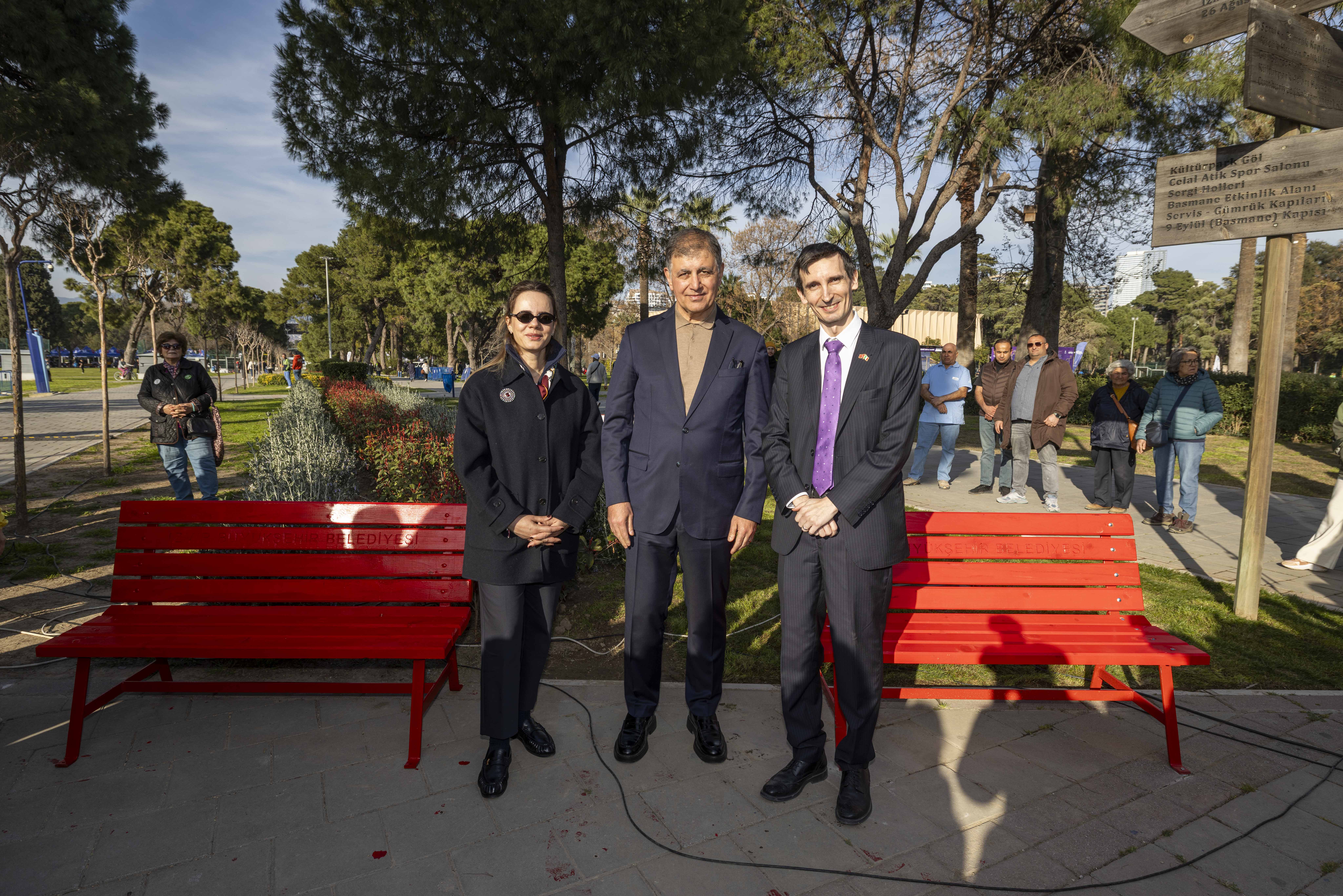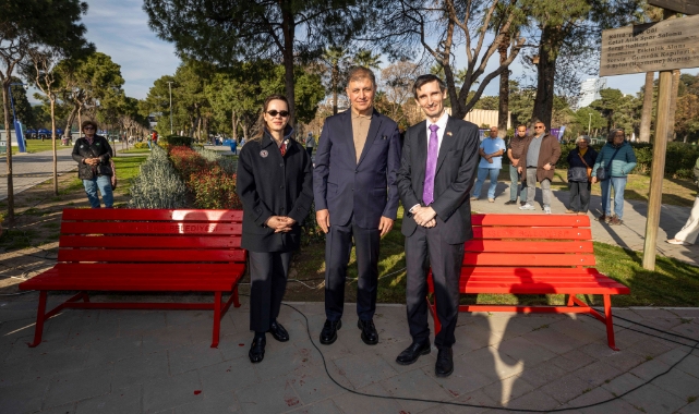 “Şiddet ve ayrımcılığa karşı mücadelenin sembolü”İzmir İtalya Konsolosu Daniele Bianchi, kırmızı bank uygulamasının kadın cinayetlerinde hayatını kaybeden kadınların yokluğunu simgelediğini belirterek, bu sembolün yalnızca bir anma değil aynı zamanda toplumsal farkındalık çağrısı olduğunu ifade etti. Bianchi, “Kırmızı bank, her türlü şiddet ve ayrımcılığa karşı mücadelenin sembolüdür. Bu konuya İtalya Dışişleri Bakanlığımız büyük önem veriyor ve dünyanın farklı şehirlerinde bu sembolün yer alması için çalışmalar yürütülüyor. Bu aslında her türlü şiddete karşı güçlü bir ‘hayır’ demektir. İzmir’de bu anlamlı çalışmayı gerçekleştirmekten büyük memnuniyet duyuyorum” diye konuştu.Kadına yönelik şiddetle mücadelenin uluslararası dayanışma gerektiren bir konu olduğunu vurgulayan Bianchi, İzmir’de gösterilen duyarlılığın bu mücadelenin güçlenmesine katkı sağladığını belirterek etkinliğe destek veren tüm kurumlara ve katılımcılara teşekkür etti.Etkinlikte konuşan İzmir Büyükşehir Belediye Başkanı Dr. Cemil Tugay ise kırmızı bankın şiddet nedeniyle hayatını kaybeden kadınları hatırlatan güçlü bir sembol olduğunu belirterek, asıl hedefin bu bankların artık ihtiyaç duyulmayan bir sembol haline gelmesi olduğunu ifade etti. Tugay, “Aslında bu bankın renginin değişmesi, beyaz ve tertemiz bir renge dönüşmesi gerekir. Kırmızı banklara sahip olan değil, kırmızı bankları kaldırabilen şehirlerden olmalıyız” dedi.Konsolosluk Binasına Kırmızı BankKonuşmaların ardından İzmir İtalya Konsolosu Daniele Bianchi, İzmir Büyükşehir Belediye Başkanı Dr. Cemil Tugay ve eşi Öznur Tugay ile iki bankı kırmızıya boyadı. Öte yandan İzmir İtalya Konsolosluğu’nun bulunduğu Heris Tower binasına da kırmızı bir koltuk yerleştirildi. İzmir İtalya Konsolosu Daniele Bianchi ile Cem Heris, bu sembolik uygulamayla kadına yönelik şiddete karşı verilen mesajın yalnızca kamusal alanlarla sınırlı kalmayacağını, toplumun her kesiminde görünür olması gerektiğini vurguladı.
