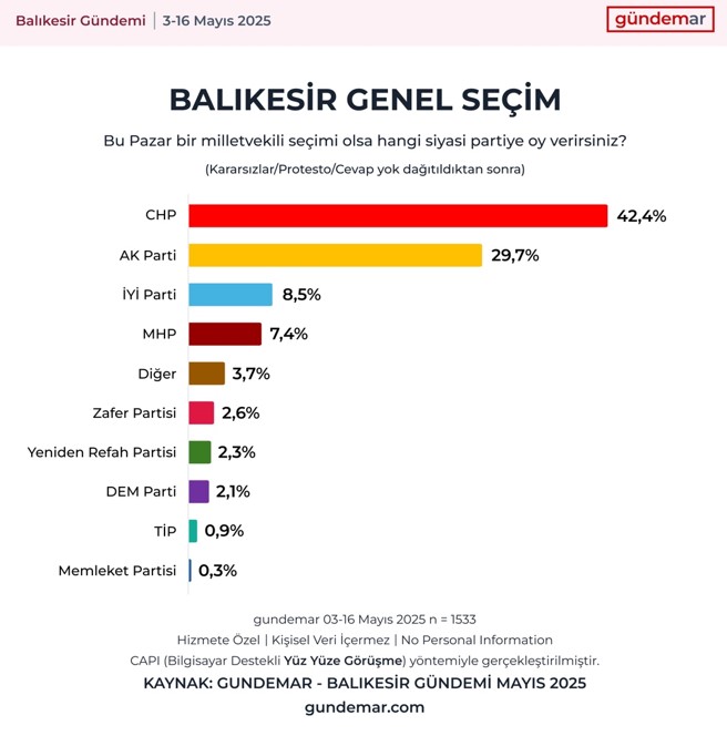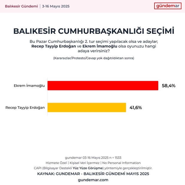 EGEMENLİK - 31 Mart 2024 seçimlerinden sonra ilk kez Balıkesir genelinde yapılan araştırma sonuçlarına göre “bu pazar seçim olsa” Balıkesir Büyükşehir Belediye Başkanı Ahmet Akın açık ara önde çıkarken, Cumhurbaşkanlığı seçiminde ise Erdoğan hem İmamoğlu, hem Yavaş, hem de Özel karşısında kaybediyor.GÜNDEMAR (Gündem Araştırma) Yönetim Kurulu Başkanı Prof. Dr. Tamer Bolat, araştırmamız “3–16 Mayıs 2025 tarihleri arasında Balıkesir’in 20 ilçesinde toplam 1533 kişi ile CAPI (Bilgisayar Destekli Yüz Yüze Görüşme) yöntemi ile yapıldı. Araştırmanın güven aralığı yüzde 95, hata payı ise artı eksi yüzde 2,47’dir” derken, “Balıkesir genelinde yaptığımız araştırma yerel seçimden genel seçime, Cumhurbaşkanı adaylarından ilçe belediye başkanlarına, Balıkesir’de ve ülkede öne çıkan gündeme dair önemli sonuçlar elde ettik” dedi.“Balıkesirli Balıkesir’de yaşamak istiyor mu? Balıkesirli Balıkesir’in en çok hangi ilçesinde yaşamak istiyor? Başlıklı araştırmayı da önümüzdeki günlerde paylaşacaklarını belirtti. AHMET AKIN AÇIK ARA ÖNDEÖnümüzdeki haftalarda bu tür araştırmaları diğer şehirlerde ve ülke genelinde de periyodik aralıklarla yapacaklarını belirterek sonuçları paylaştı: Ahmet Akın açık ara önde 31 Mart seçimlerinde Balıkesir Büyükşehir Belediye Başkanlığını en yakın rakibi AK Parti adayı Yücel Yılmaz’a 10 puan fark atarak % 51,1 oy oranıyla kazanan CHP adayı Ahmet Akın, “bugün seçim olsa” oy oranını % 58’in üzerine taşıyor.Araştırmaya göre, “protesto oy, kararsızlar ve cevap vermeyenler” 31 Mart adaylarına göre dağıtıldığında Ahmet Akın %58,6 ile açık ara önde çıkarken en yakın rakibi Yücel Yılmaz (AK Parti) %32,8, Turhan Çömez (İYİ Parti) %4,6, Tanju Akçe (YRP) %1,7, Mutlu Aksoy (Zafer Partisi) %0,8, Mehmet Rauf Kocaman (DEM) ise, %0,6 oranında oy alıyor.HENÜZ HERHANGİ BİR DEĞİŞİM OLMADISiyasi olarak bu sonuçlar ortaya çıkarken, “Balıkesir Büyükşehir Belediyesi’nin son bir yıl içindeki performansını nasıl buluyorsunuz” diye sorulduğunda araştırmaya katılanların %40’ı “herhangi bir değişim olmadığını”, %39’u ise, olumlu bir gidişat olduğunu ifade ederken, %21’lik bir kesim de, “belediyenin son bir yıldaki gidişatını olumsuz” bulduğunu beyan etmiştir.Katılımcıların %43’ü bir yıllık çalışmaları değerlendirildiğinde Balıkesir Büyükşehir Belediye Başkanı Ahmet Akın’ı “başarılı”, %19’luk bir kesim ise, “başarısız” bulduğunu belirtirken, katılımcıların %38 de “kararsız” olduğunu belirtmiştir.BALIKESİR’DE BİRİNCİ PARTİCHP Balıkesir seçmenine, “Bu Pazar erken seçim olsa oyunu hangi partiye verirsin” sorusu sorulduğunda ise, 2023 seçimlerinin ikinci partisi CHP’nin birinci parti olduğu görülüyor. 2023 Genel Seçimlerinde AK Parti’nin % 34,3 ile birinci, CHP’nin 31,7 ile ikinci, İYİ Parti’nin % 14,98 oy oranı ile üçüncü olduğu Balıkesir’de, “bu Pazar seçim olsa” oy dağılımları şöyle oluyor: CHP % 42,4, AK Parti % 29,7, İYİ Parti 8,5, MHP 7,4, Zafer 2,6, YRP 2,3, DEM 2,1, TİP 0,9, Diğerpartiler 3,7.KENT LOKANTASI HİZMETİN İLK SIRASINDABalıkesir Büyükşehir Belediye Başkanı Ahmet Akın’ın “en başarılı icraatı nedir” diye sorulduğunda katılımcıların %9,1 “Kent Lokantası”, %9,0 “halkla iletişim”, %6,7 ise “yol çalışmaları” yanıtı verirken, toplamda %41,3 “büyük icraatı yok” demektedir.Katılımcılara “son bir ayda Balıkesir için hangi konular konuşuldu” diye sorulduğunda ise “su faturaları” % 32,7 ile birinci sırayı alırken diğer başlıklar da şöyle sıralanıyor: %23,8 çöp sorunu, %21,5 Yol Yenileme, %15,5 sokak hayvanları, %13,9 Belediyedeki işten çıkarmalar.BALIKESİR NE KONUŞTU?Araştırmada “son bir ayda” Balıkesirlinin ülke gündemi için neler konuştuğu da araştırıldı. Buna göre katılımcıların %33,9’u Ekrem İmamoğlu’nun tutuklanmasını, %29,6’sı hayat pahalılığını, %24,6’sı öğrencilerin tutuklanmasını, %23,5’i İstanbul depremini, %18,4’ü İBB’ye yönelik yolsuzluk soruşturmasını konuştu.ERDOĞAN ÜÇ ADAYA KARŞI DA KAYBEDİYORBalıkesir genelinde yapılan araştırmada katılımcılara, “Bu PazarCumhurbaşkanlığı seçimi olsa ve iki aday ikinci tura kalsa kime oy verirdiniz” diye sorulduğunda ise, Cumhurbaşkanı Recep Tayip Erdoğan’ın CHP’nin Cumhurbaşkanı adayı Ekrem İmamoğlu karşısında da, CHP’nin olası diğer adayları Mansur Yavaş ve Özgür Özel karşısında da kaybettiği görülüyor.Araştırmanın sonuçları şöyle: Ekrem İmamoğlu % 58,4, Recep Tayip Erdoğan % 41,6 Mansur Yavaş % 61,9, Recep Tayip Erdoğan % 38,1 Özgür Özel % 53,8, Recep Tayip Erdoğan % 46,2.