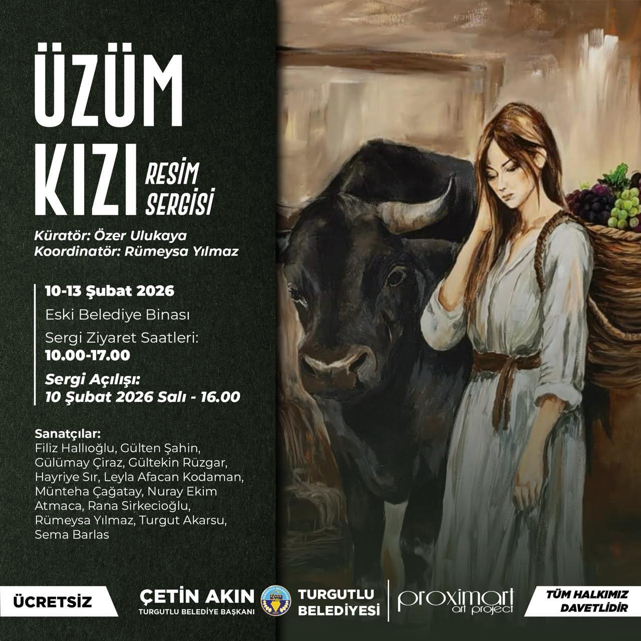 EGEMENLİK - Üzüm Kızı Resim Sergisi, yerelden evrensele uzanan bir anlatıyla, sanatın birleştirici gücünü Turgutlu’da buluşturuyor.Küratörlüğünü Özer Ulukaya’nın, Koordinatörlüğünü Rümeysa Yılmaz’ın yaptığı Üzüm Kızı Resim Sergisi Turgutlu Belediyesi destekleriyle 10-13 Şubat tarihleri arasında Turgutlu Eski Belediye Binasında sanatseverlerle buluşuyor. Serginin açılışı 10 şubat 2026 tarihinde saat 16.00’da gerçekleştirilecek.
