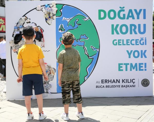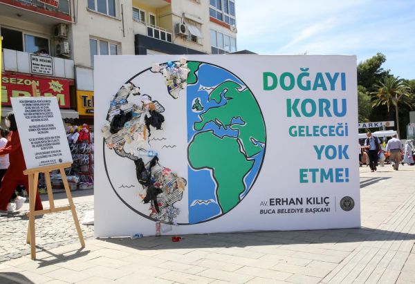 Buca Belediyesi, Dünya Çevre Günü’nde örnek bir farkındalık projesine imza attı. Vatandaşlar çöpleri yere atmak yerine Forbes Caddesi’nde konumlandırılan dünya haritasının üzerine yapıştırdı. Kısa sürede çöple dolan pano, çevre kirliliğinin yarattığı çirkin görünümü gözler önüne serdi.