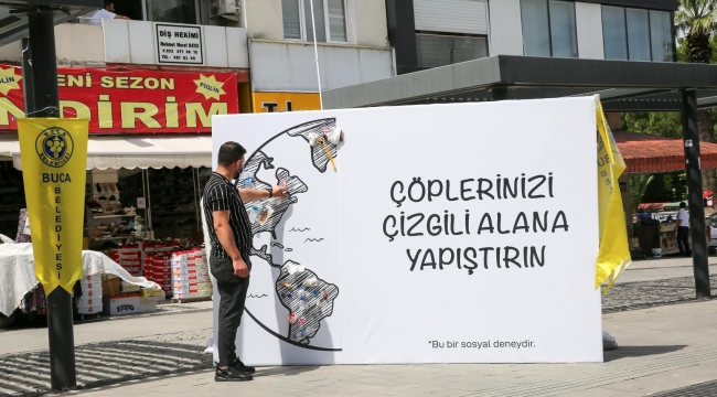 İzmir’in en kalabalık ilçesi Buca’da, giderek artan çevre kirliliğiyle ilgili ilginç bir farkındalık çalışması yapıldı. En fazla yoğunluğun yaşandığı Forbes Caddesi girişine ikiye bölünmüş dünya görseli yerleştiren Buca Belediyesi, vatandaşlardan çöplerini bu panoya yapıştırmasını istedi.