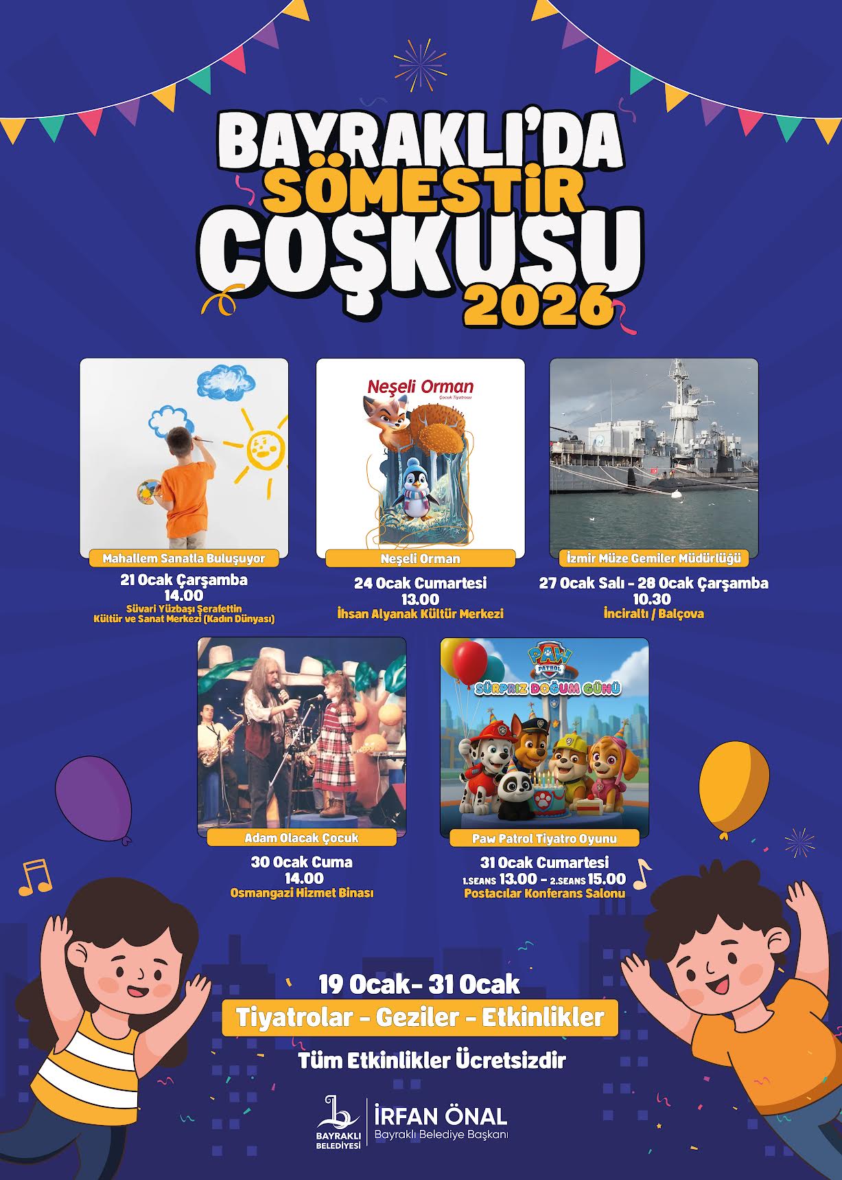 Bayraklı Belediye Başkanı İrfan Önal, yarıyıl tatiline yönelik hazırlanan etkinlik programına ilişkin yaptığı değerlendirmede, çocukların yoğun bir eğitim dönemini geride bıraktığını vurgulayarak şu ifadeleri kullandı: “Çocuklarımız uzun ve yoğun bir dönemi geride bıraktı. Aylarca ders çalıştılar, sınavlara hazırlandılar ve yoruldular. Yarıyıl tatili, hem dinlenmeleri hem de keyifli ve verimli zaman geçirmeleri için önemli bir fırsat.