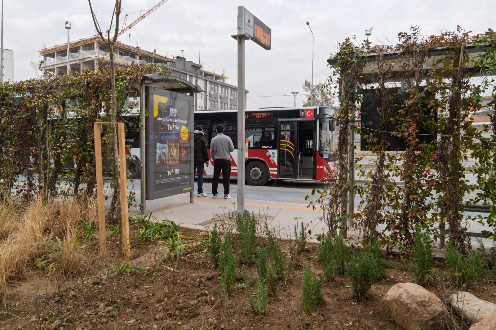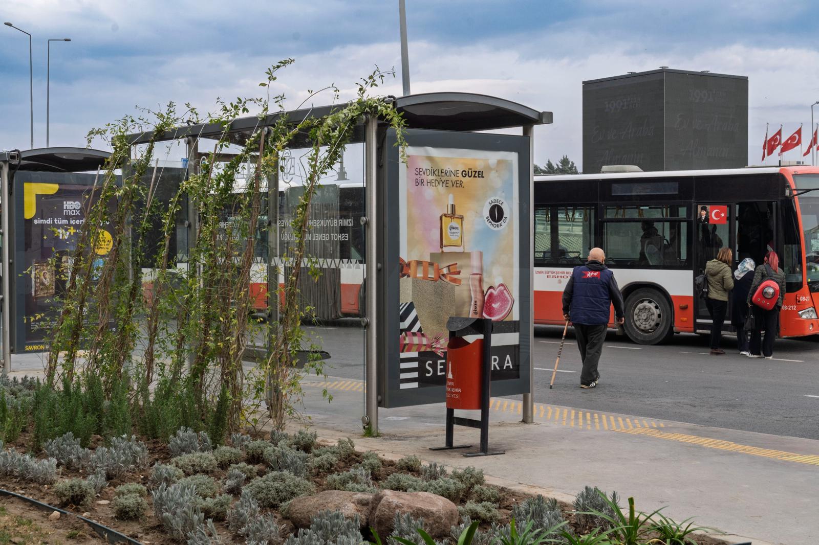 İzmir Büyükşehir Belediyesi, kamusal alanlarda yaptığı estetik dokunuşlarla kentin çehresini değiştirmeye otobüs duraklarıyla devam ediyor. Yeşil Durak projesi kapsamında durakların üstü sarmaşıklarla donatılırken, durak çevresi ise az su tüketen bitkilerle düzenleniyor.