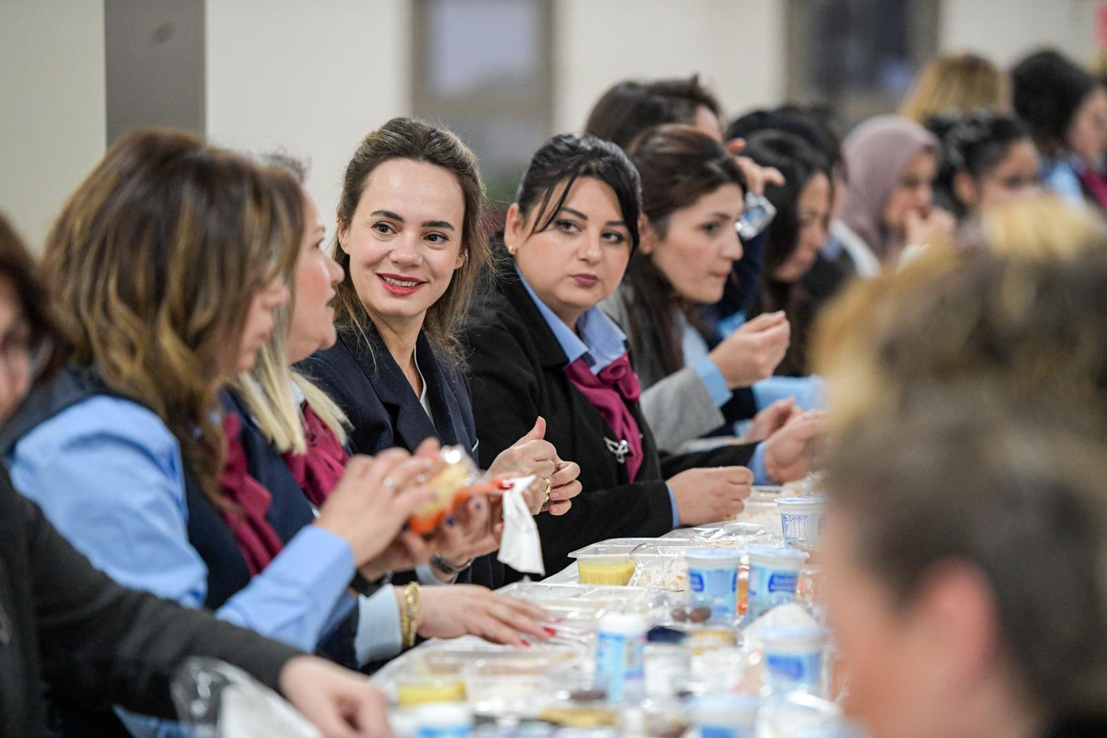 EGEMENLİK - İzmir Büyükşehir Belediye Başkanı Dr. Cemil Tugay’ın eşi Öznur Tugay, ESHOT'ta görev yapan kadın şoför ve kadın hareket amirler ve İzmir İtfaiyesi'ndeki kadın personelle bir araya geldi. Türkiye'de en fazla kadın şoföre sahip olan Eshot Genel Müdürlüğü'nün Buca Gediz Atölyesi’nde iftar sofrasına konuk olan Öznur Tugay'a, İzmir Büyükşehir Belediyesi Genel Sekreter Yardımcısı ve ESHOT Genel Müdürü Övünç Özgen, İzmir Büyükşehir Belediyesi Genel Sekreter Yardımcısı Prof. Dr. Pınar Okyay, Eşrefpaşa Hastanesi Başhekimi Doç. Dr. Başak Bayram, İzmir Büyükşehir Belediyesi Sosyal Hizmetler Dairesi Başkanı Ela Hızlı, ESHOT’un kadın bürokratları da eşlik etti. Öznur Tugay, masaları dolaşarak kadın şoförlerle sohbet etti.Tugay: İyi ki varsınızTrafikte ESHOT'un kadın şoförleriyle karşılaşmaktan büyük gurur duyduğunu söyleyen Tugay, “Gerçekten çok iyi araç kullanıyorsunuz; bunu bir sürücü olarak rahatlıkla söyleyebilirim. İyi ki varsınız, emeklerinize sağlık. Hepinize kolaylıklar diliyorum. Burada olmak benim için gerçekten çok anlamlı” dedi. Öznur Tugay, kadın şoförlerle sık sık bir araya geleceklerini belirterek, “Eğlence ve spor gibi etkinliklerle motivasyonu artırmayı hedefliyoruz” ifadelerini kullandı.Özgen: Dünyada da ilk 10 kurum arasında yer alıyoruzESHOT Genel Müdürü Övünç Özgen, kent içi ulaşımın güvenli ve düzenli şekilde işlemesinde güçlü bir ekiplerinin bulunduğunu belirterek, Başkan Dr. Cemil Tugay döneminde kadın şoför sayısının 290’a ulaştığını söyledi. ESHOT’un Türkiye’de en fazla kadın şoföre sahip kurum olduğunu vurgulayan Özgen, dünyada da ilk 10 arasında yer aldıklarını ifade etti. Bu başarının, kadınların çalışma hayatında daha güçlü yer almasını destekleyen bir anlayışın sonucu olduğunu belirten Özgen, Başkan Tugay’ın kararlı duruşunun belirleyici olduğunu ve kadın çalışanların katkısının büyük önem taşıdığını dile getirdi.ESHOT’un ilk kadın şoförlerinden Aysun Çalışır, Öznur Tugay’a çiçek takdim etti. Gecede ayrıca Öznur Tugay’a, ESHOT atölyesinde hurda malzemeler kullanılarak üretilen takı askısı ve sehpa hediye edildi.Kadın itfaiye personeli ile iftar buluşmasıÖznur Tugay, İzmir Büyükşehir Belediyesi İtfaiye Dairesi Başkanlığı’nı ziyaret ederek kadın itfaiye personeliyle de iftar yaptı. İtfaiye Dairesi Başkan Vekili Ahmet Karaman ve beraberindeki yöneticiler tarafından karşılanan Tugay, personelle sohbet etti. Kadınların zorlu ve hayati bir mesleği büyük özveriyle yerine getirdiğini vurgulayan Tugay, emeklerinin kent için çok değerli olduğunu ifade etti. Kadın itfaiye personeli de Tugay'ın ziyaretinden duydukları memnuniyeti dile getirerek görevlerini gururla sürdürdüklerini aktardı.
